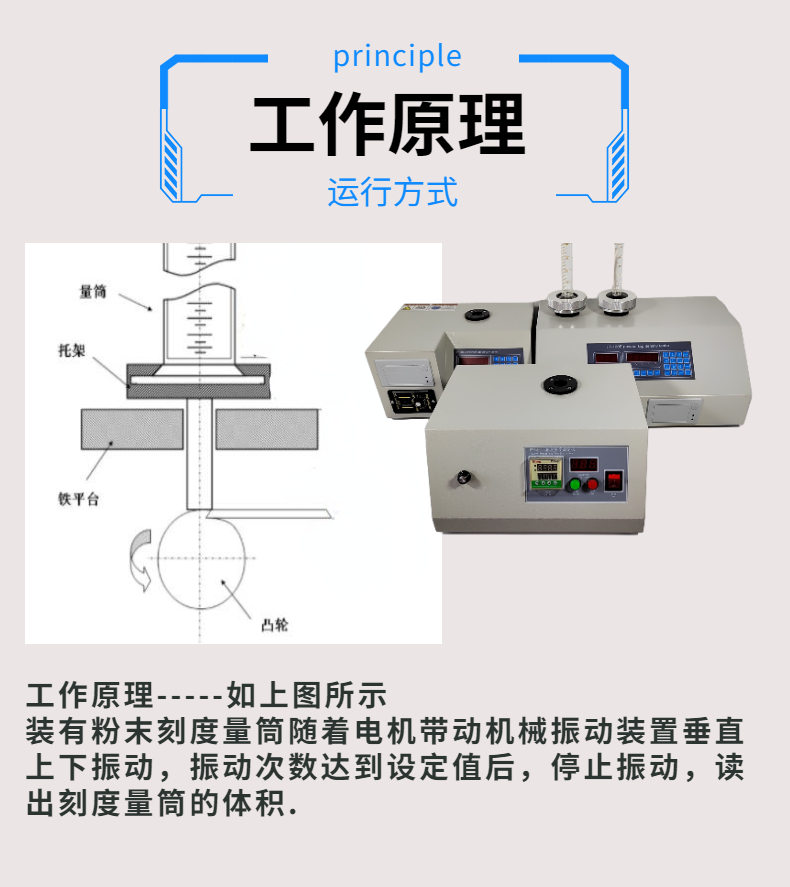 1.振實密度測定儀的工作方式:通過機械震動的方式對裝有粉末樣品的量筒進行固定頻率和振幅的敲擊,直至樣品在量筒中密實而不在下降為止,在通過密度計算公式,質量與體積之比獲得.