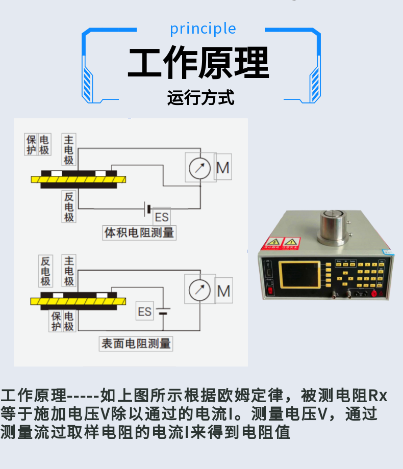 2、液晶顯示: 電阻、電阻率、電導率、電流、電壓、可輸入測試樣品數據(圓柱:直徑,高度;方體:長*寬*高)單位可以切換(mm、cm、m)