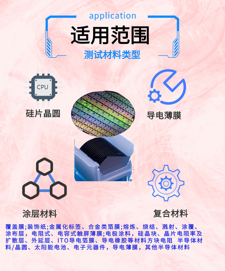 晶圓、非晶硅/微晶硅和導(dǎo)電膜電阻率測(cè)量;選擇性發(fā)射極擴(kuò)散片;表面鈍化片;交叉指樣PN結(jié)擴(kuò)散片;新型電極設(shè)計(jì),如電鍍銅電阻測(cè)量等;半導(dǎo)體材料分析,鐵電材料,納米材料,太陽能電池,LCD,OLED,觸摸屏等.